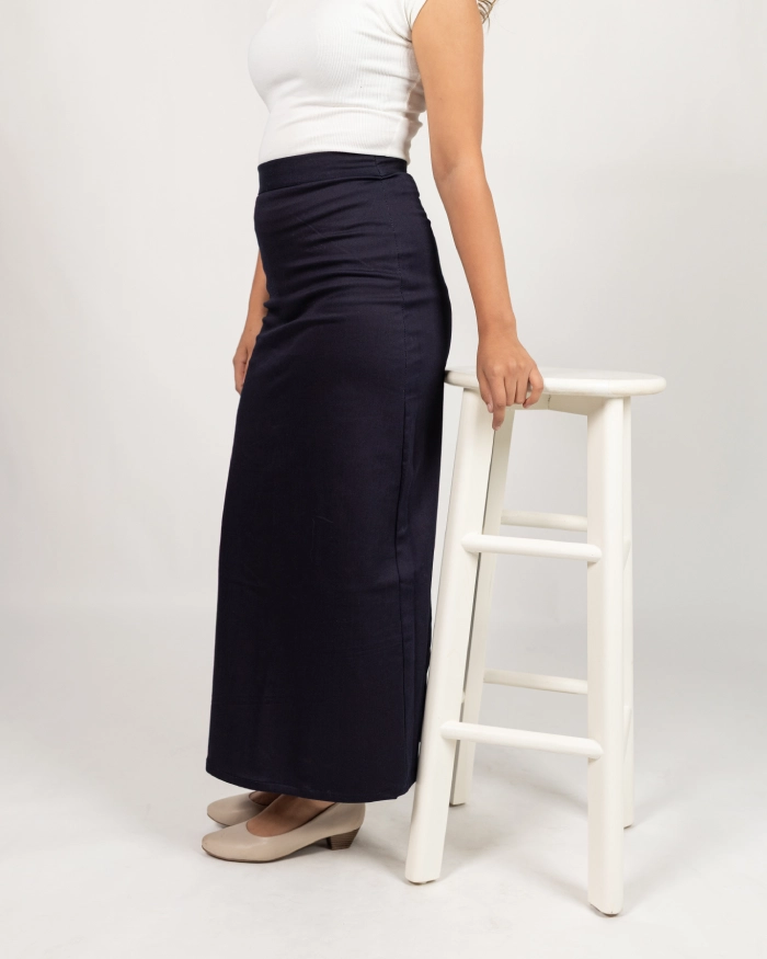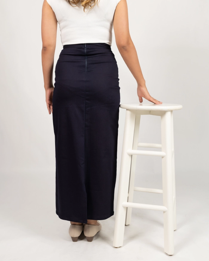 A classic mid- length denim skirt having a straight cut silhouette and slit at centre back (lower) for ease of movement. It provides a clean, streamlined look. Made with a smooth finish, this essential piece is versatile, timeless, and easy to wear across seasons.